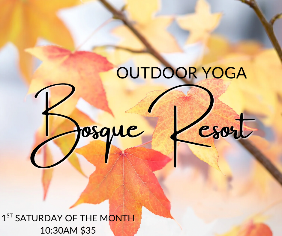 Join us for Outdoor Yoga at the Bosque Resort on the 1st Saturday of every month from 10:30 -11:30am.